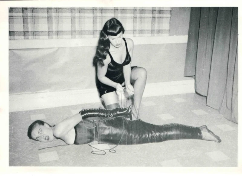 Klaw was subpoenaed on 19th May, 1955. During the hearings, Florida man Clarence Grimm testified that his son Kenneth’s suicide had been inspired by bondage imagery featuring Page. Special counsel Vincent Gaughan guided Grimm to confirm that the position in which his son was found was directly influenced by Klaw’s photographs.